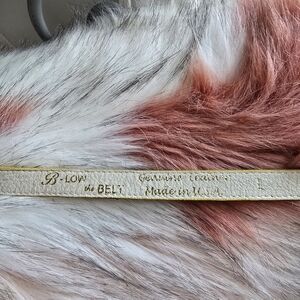 Hook Closure. Metal Yellow Floral Buckle w/ Rhinestone Center. Skinny Silhouette.