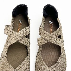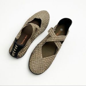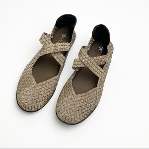 BM BERNIE MAV Bronze Basket Woven Cross Straps Mary Jane Slip On Shoes. Gently worn pre-owned condition.