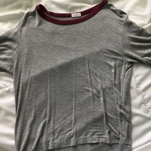 Very very very comfy, loose fitting, and basic t shirt good condition! Grey with maroon lining