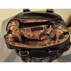 This B. Makowsky shoulder bag is the perfect accessory for any stylish woman. The black leather exterior material is accented with a zipper closure and animal print lining color. The bag has both inner and outer pockets, as well as a large size of 12 in x 9 in x 4 in. The handle/strap is made of matching black leather, while the accents are a sleek black color. This bag is perfect for any occasion and is sure to make a statement.