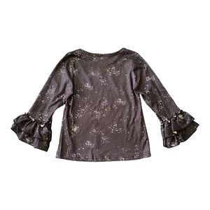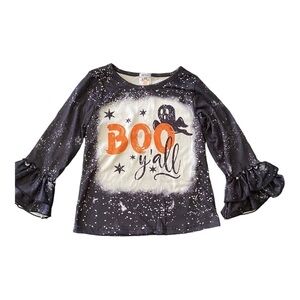 Super cute Halloween outfit, black top with ruffle cuffs with “Boo y’all”, orange leggings with orange shimmer sequins in front, excellent condition, size 5
