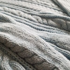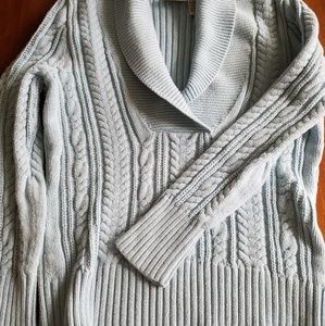 Aqua , cowl ,medium weight sweater ,beautiful cable front & sides.Back is straight ribbing.