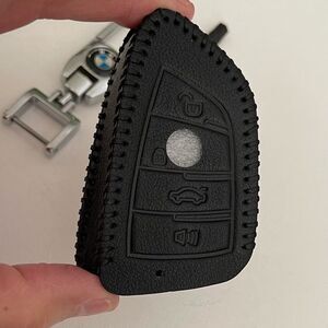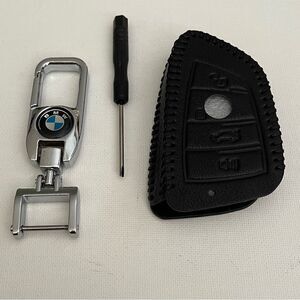 BMW Logo Key Fob Keychain in Silver & Fob Case Cover in Black Leather NWT
