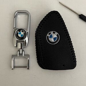 BMW Logo key fob Keychain in Silver & fob case cover in black leather NWT