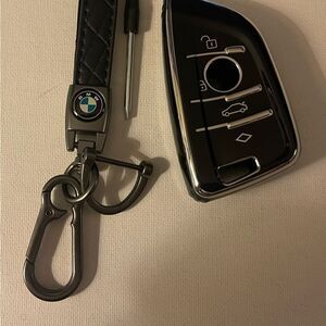 BMW Logo key fob Keychain Black Leather & Key Fob Cover in Black NWT