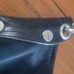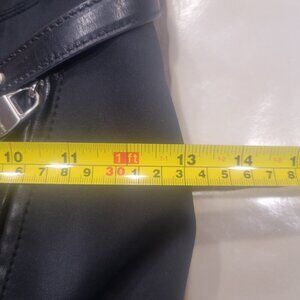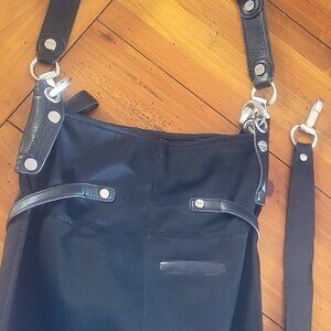Fabulous, Funky, Versatile Bag! Buckles, rivets, and more. Deep body compartment with signature B-Makowski leopard lining. interior zipper and two pockets, small pocket on outside back of bag. Two front slit pockets with zipper closures. Comes with two size straps (wearable view in photos). Fun, fun fun!
