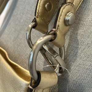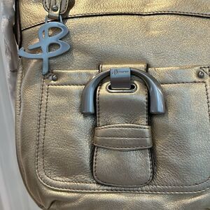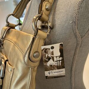 Beautiful B. Makowsky handbag is gold with brushed silver hardware. Magnetic closure front pocket. Heavy hardware. Inside compartments. Small pocket on back. Strap can be doubled for hand held wear (10”) or can be worn as shoulder length. Width across is 11”. Height is 11”.
