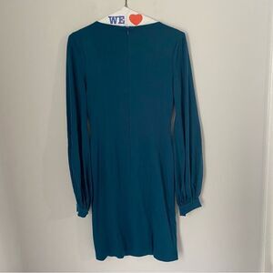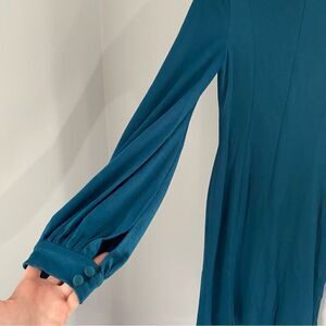 V neck. Zipper closing on the back. Long puffy sleeves. Fitted thru waist. Above knee length. Teal green / blue color.