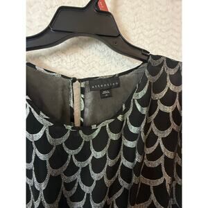 Add some shimmer to your wardrobe with this eye-catching dress from Attention. This black dress features an all-over silver scalloped pattern that creates a bold, metallic look perfect for evening events or holiday parties. The dress has a round neckline, 3/4-length sleeves, and a cinched elastic waist for a flattering silhouette. Lightweight no lining so be aware that the dress is transparent and you can see through.