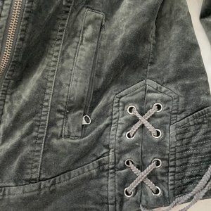 Velvet Moto jacket has asymmetrical front zipper, front pockets have zippers, sleeves and sides have laces