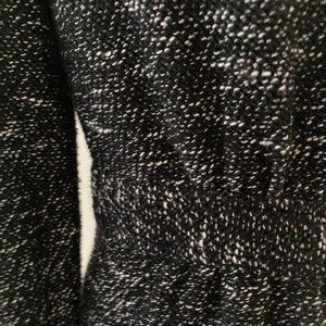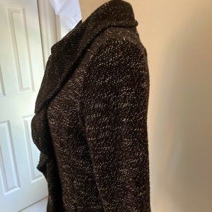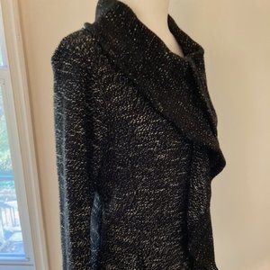 Ruffle collar cardigan sweater. This can be used as a sweater with no top beneath or as a cardigan with top since it zips up the front, very versatile for travel. Black and white, long sleeves, front zipper with ruffle covering the zipper, two front pockets. Back has an inset belt for a designer flair. 55% cotton, 45% polyester. Machine wash cold, tumble dry. So cute with skinny jeans and booties. Good Condition.