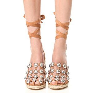 Metallic spheres cover the grid vamp on these suede Alexander Wang wedges. Wraparound straps tie at the ankle. Braided jute wedge. Leather sole.