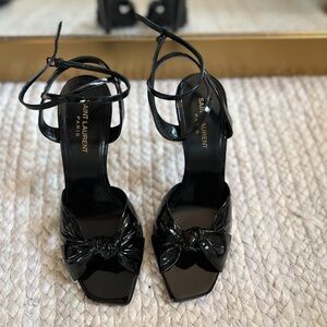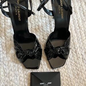 This is an authentic pair of brand new in box SAINT LAURENT Patent Amy Sandals size 40 in Black. These sandals are crafted of black patent leather and a 4.5-inch heel. Chic black patent leather heels with bow detail. Strappy design for a modern look. Perfect for elevating any outfit.