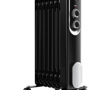 BNIB Sweetcrispy Oil Filled Radiator Heater for Indoor Use, 1500W with Adjustable Thermostat, 22.8 * 11.8 * 4.9in, New Black Sleek black electric radiator heater with adjustable controls.