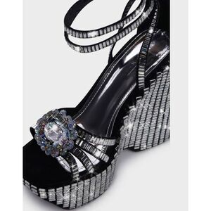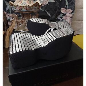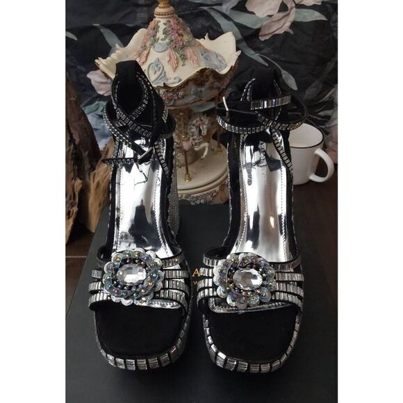BNIB~AZALEA WANG Rosalia Black & Silver Platform Sparkle Wedge Heel Sandals Sz 1