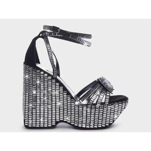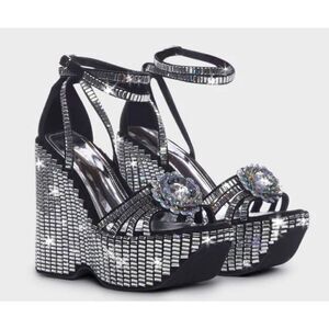 These wedges have a glitter sequin construction, an open toe design, rhinestone gem uppers, and adjustable ankle buckle closures.