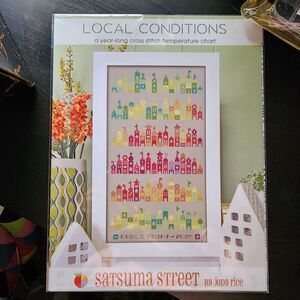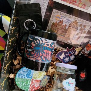 Brief list of what is included: 2 needleminders, 2 cross stitch patterns (by Summer House Stitche Workes and Satsuma Street), Mug, charm, gloves, sticker, notebook, Ort jar, coaster, and a project bag (appox. 8.5" x 11").