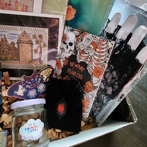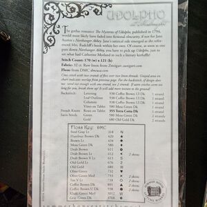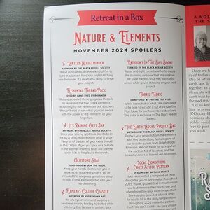 The Black Needle Society Gothic Romance and Nature & Elements Retreat in a Box. This box contains items from both the Gothic Romance and Nature & Elements Retreat in a Box subscription. I kept the fabric and floss from both boxes and a couple of other things from the Nature & Elements box. In the photos is the inserts with a detailed listing of the box items. The items with the "x" are what is included.