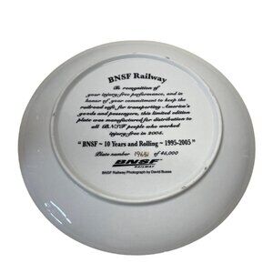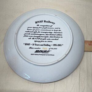 Celebrate a decade of BNSF Railway with this plate, featuring a vibrant train image. Ideal for collectors and train enthusiasts.