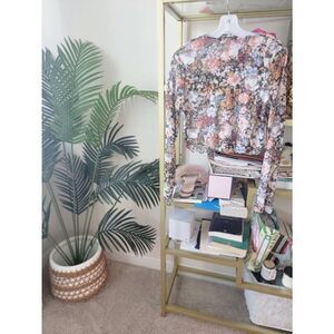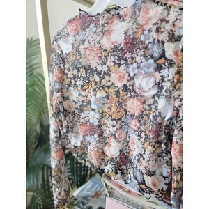 Preowned cropped sheer black floral top in great condition! Floral vintage feel. Stretchy. Can fit a medium or large! If you are a medium, this will fit slightly loose. Would fit like more of a body con style on a person who wears size large. Very stretchy and comfortable! Light and airy! Mock neck. Long sleeve. Cropped lettuce edge. Sheer/mesh material. Multicolor floral (blush pink, brown, gray, yellow, green, white burgandy orange and cream).