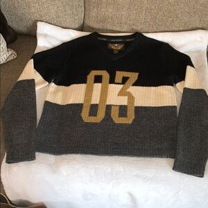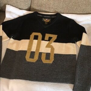 Beautiful… Harley Davidson Wool V-neck Sweater, was a total impulse buy and never got around to wearing it.. tags were removed! Stay stylish and comfortable with this women’s 100% wool sweater featuring a bold gold '03' design. The black, gray, cream color scheme adds a classic touch, perfect for any occasion.