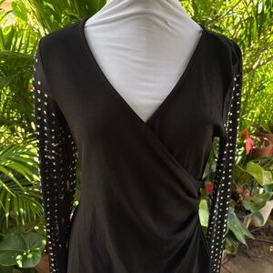Elegant black dress by Almost Famous. Adorned with striking silver studs on the sleeves. Brand new with tags. Approximate P2P 21” length 37”