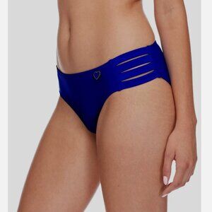 The Smoothies collection is Body Glove's classic solids swimsuit line available in an array of colors and unique styles of tops, bottoms, and one pieces. Mix and match them with other prints or wear as a pair, the combinations are endless! This bottom has side strap details, full coverage back, hipster style. Gorgeous royal blue.