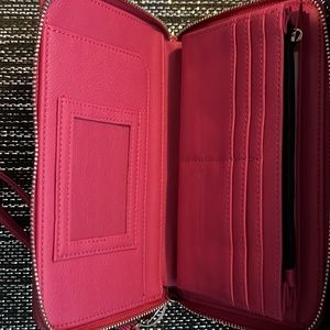 BNWT Betsey Johnson pink skull embossed wallet/ wristlet with silver tone hardware. Measurements are approx 8 1/4 inch wide and approx 5 inches tall, with a strap approx 6 3/4 inches long. Thank you for looking. Please lmk if you have any questions.