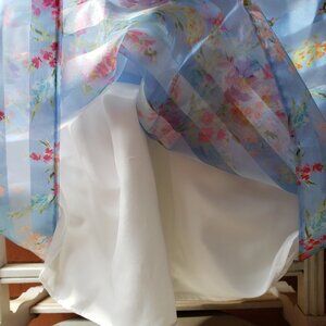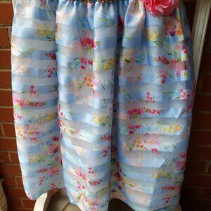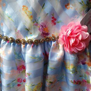 allover azure blue multicolor shadow stripe floral with jeweled waist trim and flower detail at waist