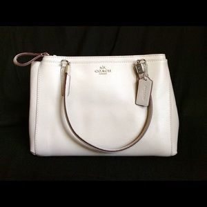 Authentic Coach Christie convertible handbag with removable adjustable crossbody strap. Interior has pale gray lining with three separate compartments - 2 zipper (for phone & 1 small zip pocket) & 1 snap button closure. Material is leather. Color is grey birch with silver tone accents. Measures 13" wide x 8.5" tall x 4.5" deep. Drop is 8" (crossbody drop 20"-22.5"). Completely brand new with tags. No dustbag, but I always package securely. Was going to gift to a friend, but gave something else.