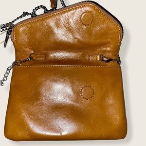 A removable chain shoulder strap with convertible wrist strap adds convenience in a variety of styling with a streamlined crossbody clutch created from worn out leather with vintage appeal. - Removable chain shoulder strap with convertible wrist strap - magnetic closure - Exterior features 1 slip pocket with 4 cards slots and 1 back slip pocket - Interior features 1 zip wall pocket - Approx. 5" H x 7.5" W x 0.25" D - Approx. 25" strap drop, 7" wrist strap length