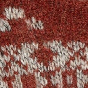 In a dark red and grey pattern, this sweater is a pull-over style with raglan sleeves.