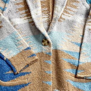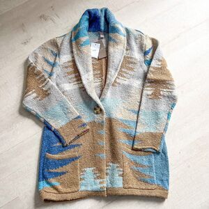 BNWT J.Jill Women Sz Medium Petite Aztec Boho Shawl Cardigan Sweater Blue Brown