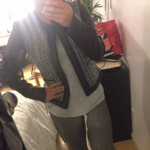 Tweed/Boucle type body with leather like sleeves. So cute!