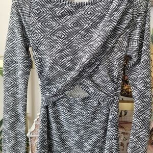 Long sleeve midi dress in a marled gray print. Bodycon form fitting fit. Super stretchy and sexy. Polyester / spandex blend. Cut outs across the stomach for a flattering date night look! Dress is not lined.