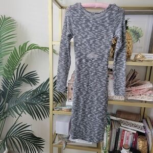 Long sleeve midi dress in a marled gray print. Bodycon form fitting fit. Super stretchy and sexy. Polyester / spandex blend. Cut outs across the stomach for a flattering date night look! Dress is not lined.