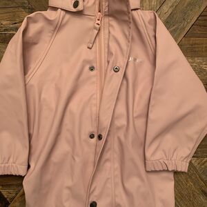 Brand new with tags. Beautiful Dusty Pink color. Zipper and snap closure. Adjustable rubber black foot straps. Removable hood.