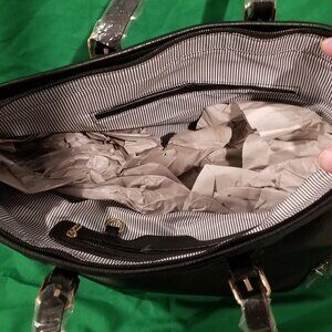 Has back zipper pocket double handles with a 10 inch drop length made of faux leather construction fully lined interior two interior slip pockets and one zippered pocket top zipper closure silver tone hardware.