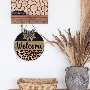 BNWT Welcome Wooden Leopard Door Hanger, Minimalist Door Sign (12x12 inch), Outdoor Welcome Hanging Sign for Front Door Porch Round welcome sign featuring leopard print and a checkered bow. Perfect for home decor.