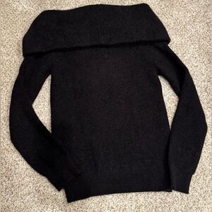 Massimo Dutti Studio black, solid, long sleeve, off shoulder sweater with double collar detail. Plush, fuzzy alpaca knit fabric construction. Off shoulder foldover overlay neckline with twisted detail at front. Banded ribbed knit cuffs & hem. Slim fit silhouette. Excellent condition