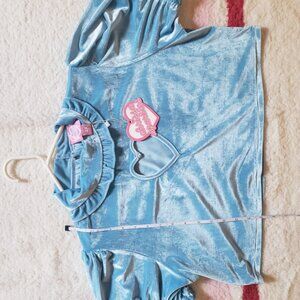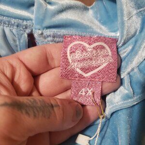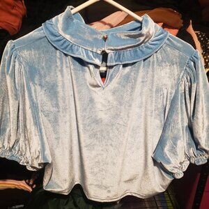 Super cute crop top design by Chrissa Sparkles which is no longer available and hard to find/rare. Shimmery, soft blue velvety feeling material and a sweet lil heart cutout are the standouts of this top but we really can't overlook the adorable ruffle edge on the sleeves or the cute lil heart buttons on the back of the neck!!! I really do love this top and I'm sad to part with it but it doesn't fit me, hence why she is brand new with tags still attached. Please check the measurements thoroughly as I found this to be too short on me (even for a crop top) and that's why I never wore it. The length of this top is 15 inches from shoulder to hem and measures 20.5 inches from side to side.