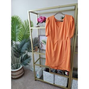 BNWT tangerine orange New York & Company Puff Sleeve Tulip Sheeth Dress, women's size XL. Features short sleeves with a v-neck. Wrap dress /tulip dress at thighs. Zips up the back. Dress has some stretch.