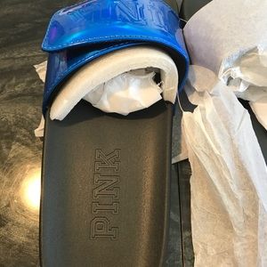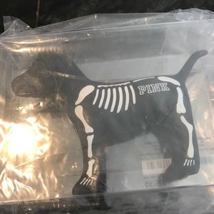 BNWT PINK Campus Essentials set includes 1 pair vivid blue slides size M-7/8 1 - mini backpack with 4 pins included, 1- 28x58 towel & 1 Halloween skeleton collectible dog I DO NOT TRADE being sold as a set rude comments will be blocked. LANYARD NOT INCLUDED!!!!