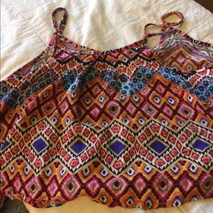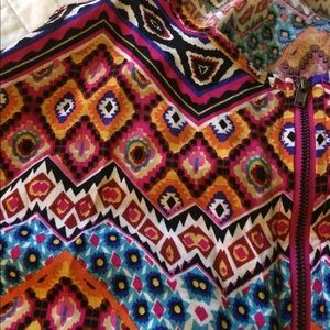 Adorable crop top with A zipper all the way down in the front and has adjustable straps... cool bright design really adorable with some white jean shorts!!! Or anything Boho!!! Tag says large but will fit med- large because of the adjustable straps!!!! Please ask any questions before purchasing ☮️😎🤘☯️