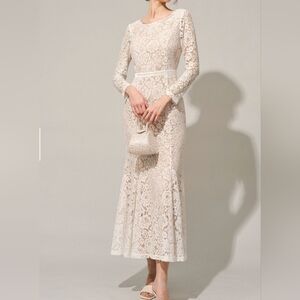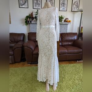Beautiful long white lace dress. Sleeve on arms are see-through.