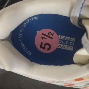 This is BNWT: SUCH an ADORABLE pair of Sketcher's. This pair of Tennis Shoes are made of white Stretchy Material. Shoes with multi-colored soles. They fit a little bigger than I thought. Unisex Sketcher's. My friend loves her pair. I purchased wrong size.. ROSS Dress For Less.. I thought they would fit but didn't. My LOSS is Your GAIN. SIZE: 5 1/2 Y. (YOUTH). This pair of shoes feels cushioned and comfortable. I needed a size 5 Y. Still fit my feet too big. I hope you love em. These are similiar to Jordan's Skittles Shoes. Yes, they are posted also...Bundle 2 or More items and even Save More $$$.