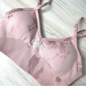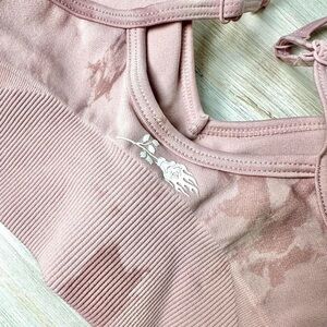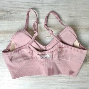 • Civil Regime seamless sports bra in a soft dusty rose pink with subtle tie-dye wash and ribbed underband for extra support.