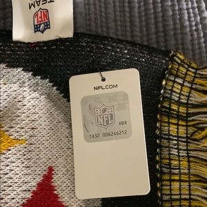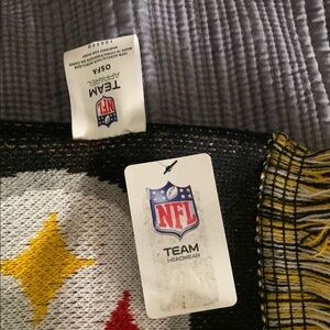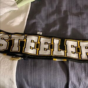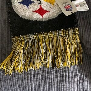 Stylish Steelers scarf in black and gold. Features team logo and fringe detail.