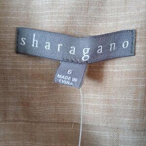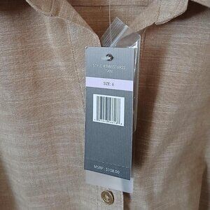 Tan button-down pleated dress with tie waist and 3/4 sleeves in size 6, brand new with tags.