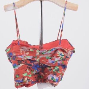 Craft a statement in your wardrobe with the Zara Red Floral Print Corset Ruffle Top. Designed for those who appreciate a blend of classic charm and contemporary style, this sleeveless tank top features an alluring V-neckline and delicate spaghetti straps that provide a customizable fit.